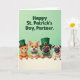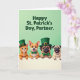 Designed with four animated animal friends leaning together over a white horizontal band, the scene feels like a close-knit group sharing a sweet St. Patrick’s Day moment 💚. A ginger cat, a reddish-brown dog with pointed ears, and two fawn-colored short-snouted dogs rest their front paws on the border as if huddling for a friendly photo. Each one wears a green top hat with a small golden buckle and a matching green bow tie, adding a festive touch ☘️. The upper background is a soft pastel green that sets off the warm orange and tan fur tones. Near the top, a short greeting appears in dark green letters, centered and easy to spot against the pale backdrop. Their faces add gentle warmth: the cat’s wide eyes look tender, the pointed-eared dog smiles with its tongue out, and the two short-snouted dogs grin as if sharing an inside joke. The larger short-snouted dog looks a bit more reserved while the smaller one shows a tiny tooth, and all four hats tilt slightly above their heads. The white band runs straight across the lower third, with their paws lined up along its top edge.
