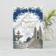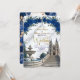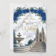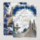 Set the tone for a majestic celebration. This design features a romantic cathedral scene with royal blue blooms and faux gold accents, perfect for fairytale unions.