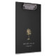Chic personalised clipboard features two lines of custom text in classic white lettering, on a rich charcoal grey background adorned with a tropical palm tree illustration in faux gold foil. Design repeats on reverse side.