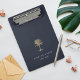 Chic personalised clipboard features two lines of custom text in classic white lettering, on a navy blue background adorned with a tropical palm tree illustration in faux gold foil. Design repeats on reverse side. Please note that this clipboard is a mini size; full size version also available in our Gold Palm Tree collection.