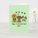 This greeting card shows three puppy friends standing close together on a pale lime-green background that feels like early spring, with a sweet, affectionate closeness in the way their big eyes seem to meet. Each pup wears green glasses and festive clothing: one in a ribbed green sweater, one in a shamrock bandana, and one in a green-and-white striped sweater, each featuring a little clover detail 💚. Darker green shamrocks drift above their heads like confetti, adding extra St. Patrick’s Day charm ☘️. The orange pup has a tiny tongue peeking out, giving the group a teasing, friendly energy, while the others look on with soft, welcoming expressions. The message “Happy St. Patrick’s Day! Wife,” appears in rounded, bubbly green lettering along the lower portion of the design, standing out clearly against the light background. The characters are centered as a tight trio, with the shamrocks spaced around them so the scene feels airy rather than crowded. Small clover icons repeat on the outfits and echo the floating shamrocks above, all in shades of green against the pale lime field.