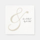 Faux handwritten notation wedding napkins with large exaggerated ampersand in beige and causal faux handwritten script bride and groom name and wedding date in black.