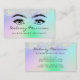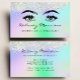 This glamorous modern business card features a sketch of two eyes with elegantly arched eyebrows in black on a faux holographic background image in purple and green. A sprinkling of faux glitter decorates the top edge of the card. Personalize it with your name in black handwriting-style script and title and contact information in black sans serif font.