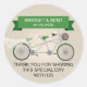 Bicycle-themed weddings are a fun trend in themed weddings. On this faux linen background wedding invitation, a green accented tandem bicycle symbolises the married couple-to-be riding off together. The bride's seat has a wedding veil wrapped around it and the groom's seat has an untied bow tie wrapped around the handlebars. A bridal bouquet is placed in the bike's basket. The couple's names and event date stand out in a matching plum banner over the bike. A customised message prints below. Makes a great envelope or package seal, use to seal favours or use as an informal thank you. Available with matching products with a option of his and her bicycles.