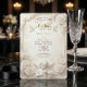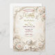 Announce your sacred union with the timeless grandeur of the Renaissance. This design features heavenly aesthetics and lush florals for a truly romantic tone.An intricate visual composition inspired by classical European architecture. The design showcases a faux sculptural relief effect, simulating the look of carved stone and architectural molding in soft champagne and beige tones. A central vignette features a delicate illustration of a cherub playing a violin, accompanied by white doves in flight and lush clusters of cream and blush roses. The background mimics a textured marble surface, while the typography simulates the sheen of gold leaf.This is a flat printed image with a faux stone and gold effect, not actual raised material, embossing, or metallic foil.