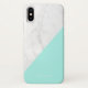 Modern and customisable iPhone case featuring white faux marble background with aqua blue accent. Other colours are available.
