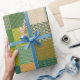 A roll of chic Giftwrap, with a Faux Patchwork pattern of tribal patterns, stripes and polka dots in Green, Rusty Red, Navy Blue and Old Gold; from the Posh & Painterly 'Jungle Drums" collection.