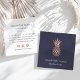 Elegant square business cards feature a faux rose gold foil pineapple illustration on a rich midnight blue background with two lines of custom text in white. Add your contact information to the reverse side. Includes three rose gold social media icons and a field for your username.
