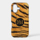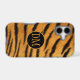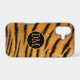 Here's an interesting and exotic phone case that features your monogram in orange gold at the centre of a black, gold framed circle banner. The banner is placed on a orange and black striped faux tiger fur pattern background. This case will be noticed!