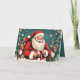 Faux vintage illustration with Santa Claus and small deers. Design on horizontal greeting card with wishes inside.