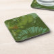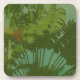 The original artwork by HomeWare on this Coaster uses an original photograph to create the illusion of retro or vintage fabric. In the photo, deep green tropical leaves, in bright sunlight and deep shadow, fan out across a background of deep blue sky. The design has an antique green tint over it, and a texture which gives it a look of old silk fabric.