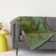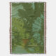 The original artwork by HomeWare on this Throw Blanket uses an original photograph to create the illusion of retro or vintage fabric. In the photo, deep green tropical leaves, in bright sunlight and deep shadow, fan out across a background of deep blue sky. The design has an antique green tint over it, and a texture which gives it a look of old silk fabric.