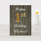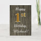 This simple birthday card design features the message "Happy 1st Birthday", with the "1st" having a faux gold-like appearance. It also features a personalised name, and a faux wood appearance background. It could be given to somebody who is celebrating their first birthday.