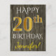 This simple, personalised birthday postcard design features the message "HAPPY 20th BIRTHDAY", with the "20th" having a faux gold-like appearance. The front also features a custom name, and a faux wood look background. The back features a customisable birthday message, along with the customisable address of the birthday postcard recipient. It could be given to somebody who is celebrating their twentieth birthday. [~Z0000066]