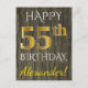 This simple, personalised birthday postcard design features the message "HAPPY 55th BIRTHDAY", with the "55th" having a faux gold-like appearance. The front also features a customised name, and a faux wood look background. The back features a customised birthday message, along with the customisable address of the birthday postcard recipient. It could be given to somebody who is celebrating their fifty fifth birthday. [~Z0000066]