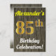 This birthday party invitation design features a message like "Alexander’s 85th Birthday Celebration!", where the name can be customised, and where the number "85th" has a faux gold-like appearance. It also features a rustic faux wood look background. The event details on the back can be customised. It could be used to invite people to somebody’s eighty fifth birthday celebration or birthday party. [~Z0000119]