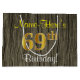 This simple, rustic birthday gift bag design features a personalised message like "Name-Here’s 69th Birthday!" (with the "69th" having a faux/imitation gold-like colouring look) on a faux wood look pattern background. The name is in script-like, yellow-coloured text, and can be customised. A personalised birthday gift bag like this could perhaps be used when giving a present or gift to somebody who is celebrating their sixty ninth birthday. [~Z0000259]
