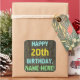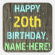 This fun birthday-themed sticker design features a message like "HAPPY 20th BIRTHDAY, NAME-HERE!", where the name can be personalized. The background features a rustic, brown, faux wood grain appearance pattern. The customizable message text features colors like blue, yellow, and green, and it has an appearance inspired by that of painted, stenciled lettering. Stickers like these could perhaps be given as a gift, or perhaps be used as decorations at a birthday party being held for somebody who is celebrating their twentieth birthday. [~Z0000296]