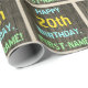 This fun birthday-themed wrapping paper design features a message like "HAPPY 20th BIRTHDAY, FIRST-NAME!", where the name can be personalised. The background features a rustic, brown, faux wood grain appearance pattern. The customisable message text features colours like blue, yellow, and green, and it has an appearance inspired by that of painted, stenciled lettering. Wrapping paper like this could perhaps be used when wrapping birthday gifts being given to somebody who is celebrating their twentieth birthday. [~Z0000293]