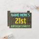 This fun birthday party invitation design features a message like "NAME-HERE’S 21st BIRTHDAY PARTY!", where the name can be personalised, on the front. The background features a rustic, brown, faux wood grain appearance pattern. The customisable message text on the front features colours like blue, yellow, and green, and it has an appearance inspired by that of painted, stenciled lettering. The back features a personalised message that could include important details about the birthday party, such as when and where it is being held, along with any other information that is relevant. Birthday party invitations like this might be a fun way to invite family and friends to a birthday party being held for somebody who is celebrating their twenty first birthday. [~Z0000291]