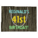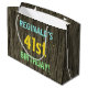 This fun birthday gift bag design features a message like "REGINALD’S 41st BIRTHDAY!", where the name can be personalised. The background features a rustic, brown, faux wood grain appearance pattern. The customisable message text features colours like blue, yellow, and green, and it has an appearance inspired by that of painted, stenciled lettering. A birthday-themed gift bag like this might be a silly way to wrap a gift for somebody who is celebrating their forty first birthday. [~Z0000319]
