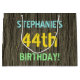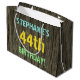 This fun birthday gift bag design features a message like "STEPHANIE’S 44th BIRTHDAY!", where the name can be personalised. The background features a rustic, brown, faux wood grain appearance pattern. The customisable message text features colours like blue, yellow, and green, and it has an appearance inspired by that of painted, stenciled lettering. A birthday-themed gift bag like this might be a fun way to wrap a gift for somebody who is celebrating their forty fourth birthday. [~Z0000319]