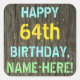 This fun birthday-themed sticker design features a message like "HAPPY 64th BIRTHDAY, NAME-HERE!", where the name can be personalised. The background features a rustic, brown, faux wood grain appearance pattern. The personalised message text features colours like blue, yellow, and green, and it has an appearance inspired by that of painted, stenciled lettering. Stickers like these could perhaps be given as a gift, or perhaps be used as decorations at a birthday party being held for somebody who is celebrating their sixty fourth birthday. [~Z0000296]