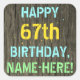 This fun birthday-themed sticker design features a message like "HAPPY 67th BIRTHDAY, NAME-HERE!", where the name can be personalised. The background features a rustic, brown, faux wood grain appearance pattern. The customisable message text features colours like blue, yellow, and green, and it has an appearance inspired by that of painted, stenciled lettering. Stickers like these could perhaps be given as a gift, or perhaps be used as decorations at a birthday party being held for somebody who is celebrating their sixty seventh birthday. [~Z0000296]