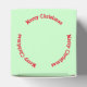 Santa, relaxed in shorts and t-shirt, wearing sun glasses, stands within circle of red text on front and back.On sides is an tree designed with green lines. On top, top has circled text only. Circle repeats "Merry Christmas" three times.