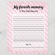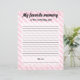 Create lasting memories with Favourite Memory of the Birthday Girl! Featuring a charming design with pink stripes and glitter accents, this memory sheet allows guests to write down their favourite memories of the birthday girl. It's a heartfelt and personal touch that adds warmth and love to any celebration. Perfect for birthdays, showers, and more, these sheets can be collected and cherished as a keepsake. Encourage your guests to share their special moments and make the birthday celebration even more memorable!