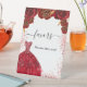 A party favour sign. A white background with red faux glitter sparkles, a red dress and red roses, florals.