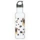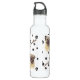 This water bottle features an artist's portrait of an adorable fawn coloured Pug dog. The image is repeated around the perimeter of the bottle and placed on a background sprinkled with black paw prints. Your name or other text in brown is also repeated around the perimeter.