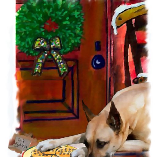 Stunning Holiday art of a fawn Great Dane waiting on the porch for Santa to arrive. Patiently the Dane lays and guards the cookies placed there for Santa to enjoy.