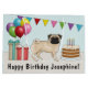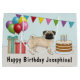 Destei's original cartoon illustration of an adorable fawn coat colour Pug breed dog. The dog is placed in a colourful birthday setting. There is a birthday cake with some candles on it, colourful birthday balloons and a bunting banner as well as two present boxes. There is also a personalizable text area.