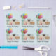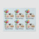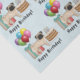Destei's original cartoon illustration of a cute fawn coat colour Pug breed dog. The dog is placed in a colourful birthday setting. There is a birthday cake with some candles on it, colourful birthday balloons and a bunting banner as well as two present boxes. There is also a personalizable text area that now reads: "Happy Birthday!". The design is placed six times creating a small pattern.