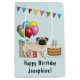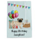 Destei's original cartoon illustration of an adorable fawn coat colour Pug breed dog. The dog is placed in a colourful birthday setting. There is a birthday cake with some candles on it, colourful birthday balloons and a bunting banner as well as two present boxes. There is also a personalizable text area.