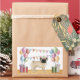 Destei's original cartoon illustration of a cute fawn coat colour Pug breed dog. The dog is placed in a colourful birthday setting with pastel colour birthday balloons, gifts and a bunting banner. The pastel colours include pink, green, blue, red, orange and purple. The dog is standing on a yellow wood floor texture and the background has a playful pastel colour polka dot pattern.
