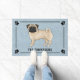 Destei's original cartoon illustration of an adorable fawn coat colour Pug breed dog. The dog is standing and looking towards the viewer. The tail is curled on the top of the dog's back. The body colour is light beige, but there are darker details on the dog's ears, muzzle and eyes creating the look of a "black mask" known to fawn colour Pugs. There is also some darker shading on the tip of the dog's tail. The dog's mouth is closed and the eye colour is brown. The background colour is blue with a decorative texture. The texture can be removed and the background colour can be changed to any other colour, if so wished. The design is framed by a stylish border. There is a dog paw print silhouette in each corner as well. Under the dog image there is a personalizable text are for a family name or other custom text such as "welcome", for example.