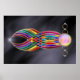 A brilliantly-coloured flowing abstract framed in gold and studded with diamonds and pearls. Sinuous glowing streams of red, yellow, green, blue, purple, and pink curve smoothly, crisscrossing from one great pearl down to the tip, accented at the end by a starburst. This rainbow design is laid against a background of black silk.