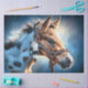 This western foal portrait features a softly brushed pinto baby horse wearing a detailed leather bridle accented with feathers. The rich chestnut and cream coat glows against a moody blue background, giving this artwork a modern ranch feel that horse lovers, cowgirls, and cowboys will all adore.
