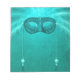 Features a masquerade mask topped with a fan of feather and dangling tassels on the sides. Done in a dark teal turquoise and white. An elegant design.