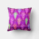 A fun and colourful pillow with a pattern of abstract illustrated feathers. Digital art. The background colour is a dark purplish pink.
