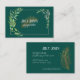 Spruce green and cool green foliage colours frame your business information. Golden plumed feather pen accents.