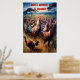A lively group of chickens pecking and clucking in a vast field under the bright sun, showcasing their vibrant colours and charming antics.