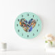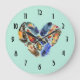 A cute clock with a watercolor design of feather in a heart shape. Colours include yellow, orange, blue, green and brown. Some have stripes, dots, tribal patterns and other unique creative decorative arrangements. Set on a mint green background.