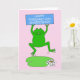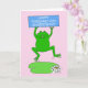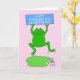 A giant cartoon frog leaping above a very big lily leaf and white flower, against a pastel pink background. The frog holds a blue rectangular sign that says Happy February 29th Birthday'.