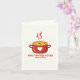 This 'get well' greeting card features a charming cartoon-style illustration of a bright red pot filled with steaming yellow soup, garnished with vibrant green herbs. The pot has two cute handles on either side and emits wavy red steam lines from the top, adding a cosy and comforting touch to the design. A white heart on the front of the pot adds a sweet and caring element to the overall look. The text "hope you feel better Soup-er Soon" is written in a warm orange font below the pot, standing out against the plain white background. 🥣💚