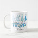 This festive coffee mug features text image "Feeling a little frosty" with snowman, snowflakes and winter trees. Add your name to personalise. Perfect for the holiday season.