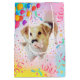 Features Fee with a toy in her mouth amidst balloons and confetti