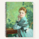 This design features a painting by the Scottish artist George Henry (1858–1943), who was one of the most prominent members of the Glasgow School of art. It is a portrait of a beautiful young woman named Felicity. She is seated at a table and she is wearing a turquoise-blue dress. Her elbows are resting on the table and she is holding her hands together beside her face. Felicity is starting intently at the viewer. She is clearly an elegant woman. Her chestnut-brown hair is fashionably styled and she is wearing a scarf over her dress, that is a slightly darker shade of turquoise than the dress itself. There is greenery in the background, suggesting that she is sitting outside in a garden. The original artwork was painted by George Henry in 1916.